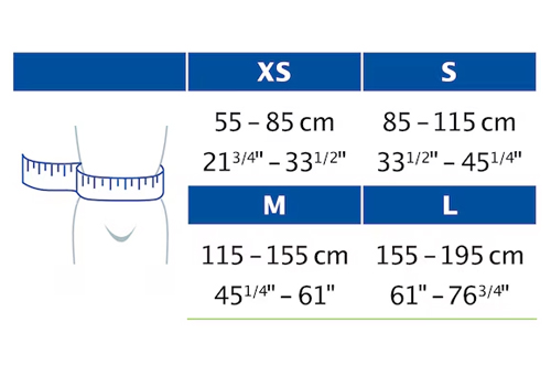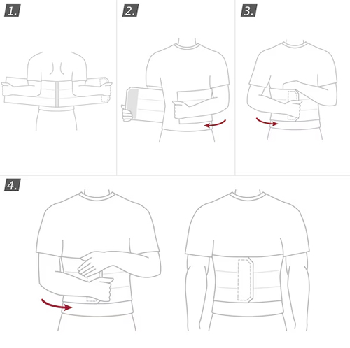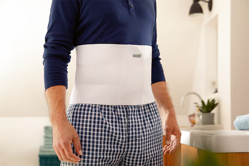 Abdominal binder that helps to reduce pain and supports wound healing through constant individual compression around the abdomen after surgery or trauma.