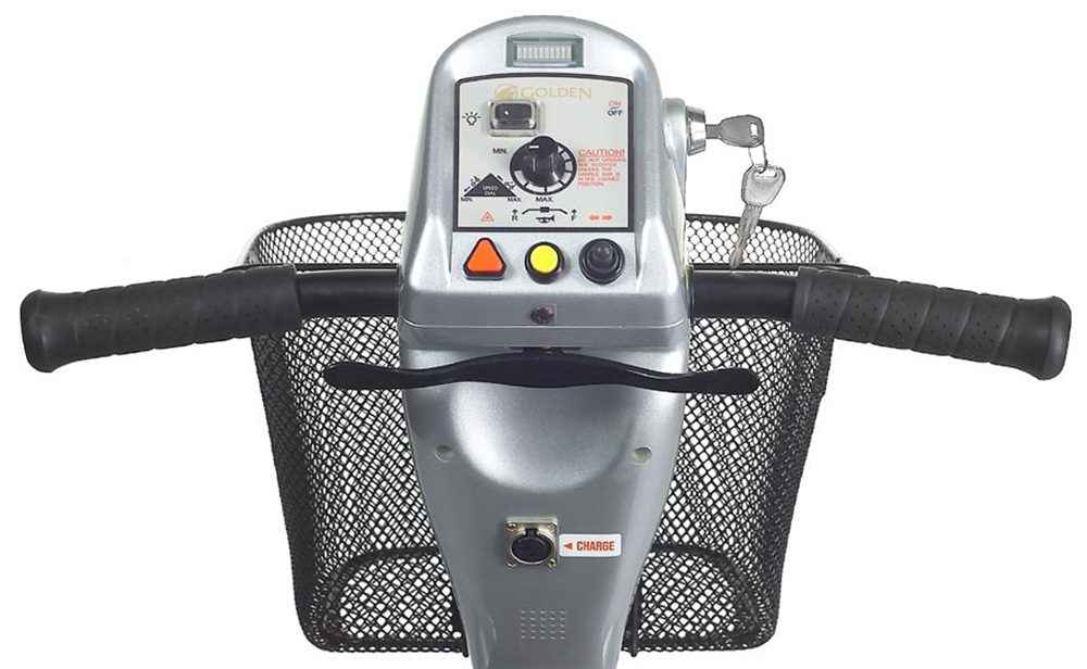 The Golden Avenger — a four-wheel, heavy-duty scooter — provides an impressive blend of rugged outdoor maneuverability while giving a smooth, comfortable ride over a variety of nature’s most challenging terrains. Durable and stylish, the Avenger includes a standard front basket, a full lighting package and an extra roomy seat with an adjustable headrest. If power is what you need, look no further than the Avenger. Featuring a 500 lb. weight capacity, the Avenger uses two NF-22 batteries that provide a range of up to 18 miles between charges.